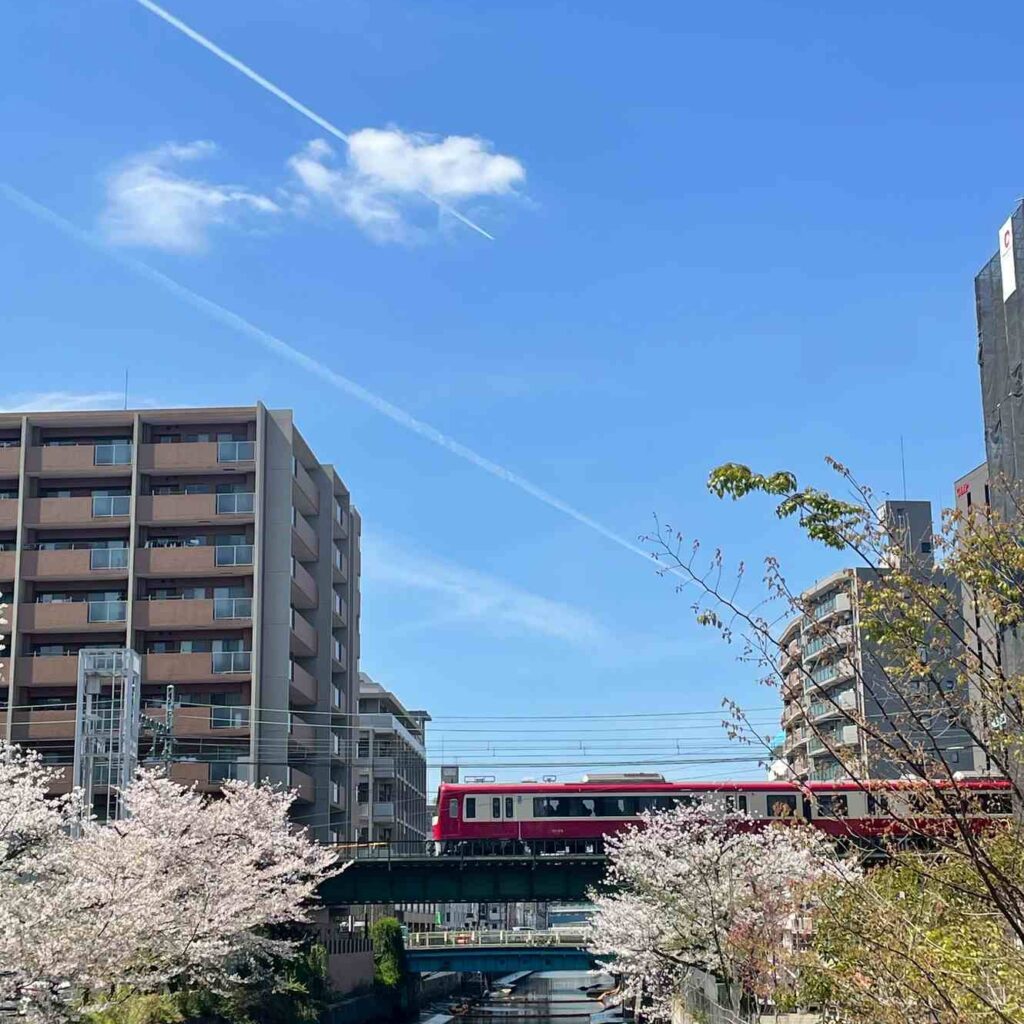 さっそく、満開の桜を眺めながらの地域清掃です。 途中のカメラスポットで、京急線が通る瞬間をパシャリ♪